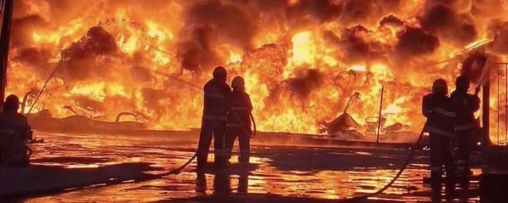 O combate ao fogo envolve 142 bombeiros e há dificuldade para controlar as chamas por causa do tipo de material existente no local: veículos e componentes como plásticos, pneus, combustíveis e produtos industriais tóxicos e inflamáveis.